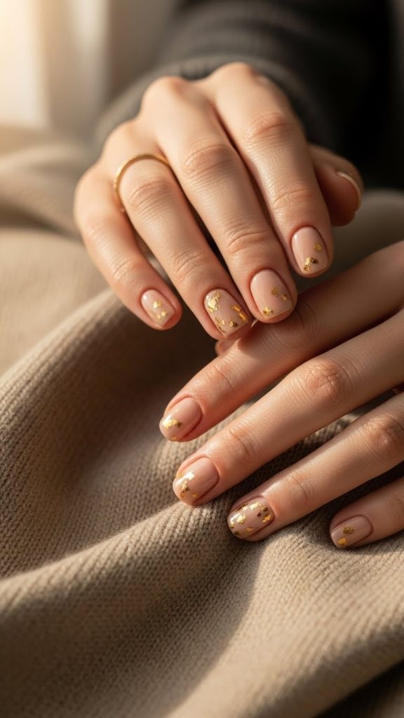 Short nude nails with tiny gold lines, flakes, or dots are perfect for winter holidays and everyday elegance. This style transitions seamlessly from casual to special occasions.
